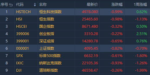 港股方面,本週恒生指數跌幅1.13%,報25465.6點;恒生科技指數漲幅0.62%,報4978.08點;國企指數漲幅0.5%,報8671.48點。