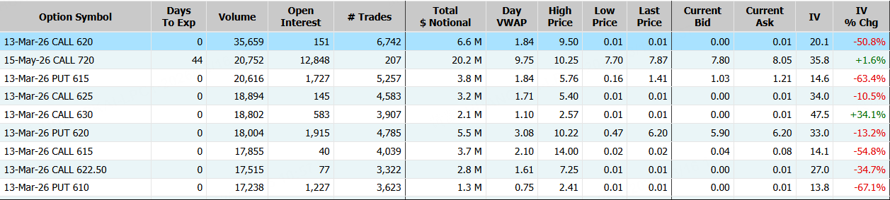 Meta Platforms上週五跌近4%,期權合約成交86.03萬張,3月13日到期的620美元的行權看漲期權交易量特別高,共有35,659份合約交易。