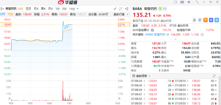 熱門中概股多數走高,阿里巴巴漲近3%,騰訊音樂、嗶哩嗶哩、理想汽車、蔚來均漲超2%,拼多多漲近2%。