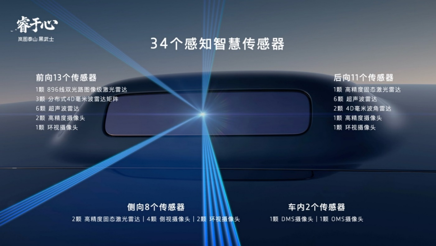在與華爲乾崑的深度優勢互補下,嵐圖泰山Ultra及黑武士搭載了華爲目前最新的乾崑ADS V4.1激光雷達方案,配備了包括激光雷達,高清攝像頭、毫米波雷達、超聲波雷達在內共計34顆高精度傳感器,構建起全場景無死角的感知網絡,爲高階智能輔助駕駛決策提供可靠依據。尤其核心的全球量產最高規格896線雙光路圖像級激光雷達,相比傳統192線激光雷達,896線激光雷達實現了斷層領先,針對30cm高度障礙物最遠識別距離高達162米,針對14cm小目標也能實現120米遠距識別,真正實現了從“點雲級”到“圖像級”的跨越,是目前行業感知硬件的“天花板”。