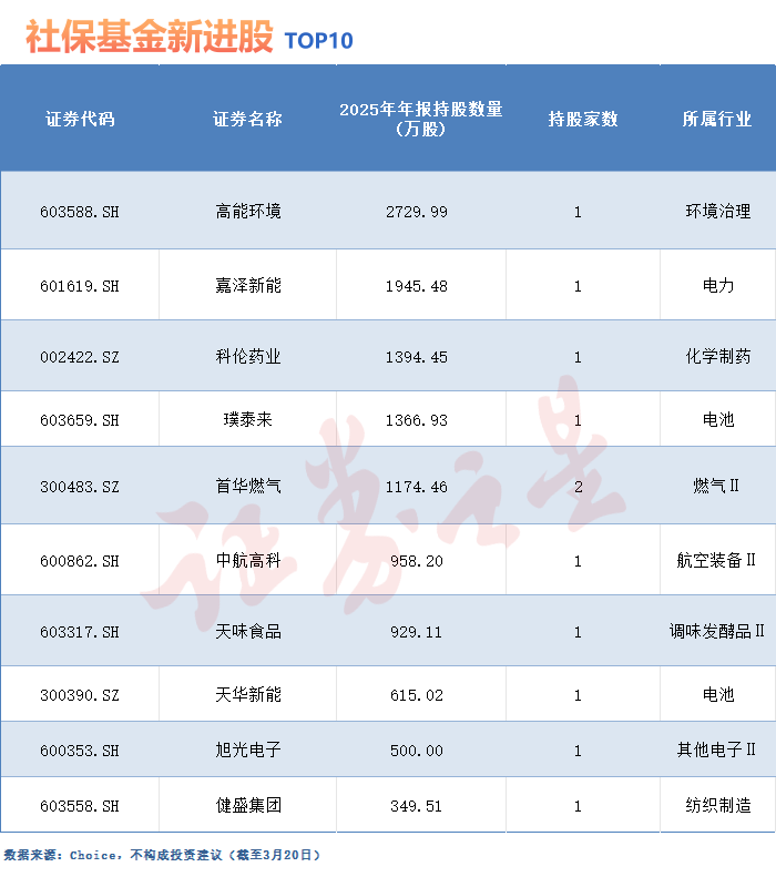 在新進個股中,高能環境的持股數量位居榜首。截至2025年末,社保基金持有近2730萬股高能環境,爲其第六大流通股股東。公司核心業務涵蓋固廢危廢資源化利用、生活垃圾處理、環境修復等領域,同時兼顧固廢危廢無害化處置、水處理、大氣污染治理、有機垃圾治理等多元業務。社保基金此時大舉建倉,或許正是看中了其在土壤修復、危廢處置等領域的技術壁壘及未來業績釋放的潛力。
