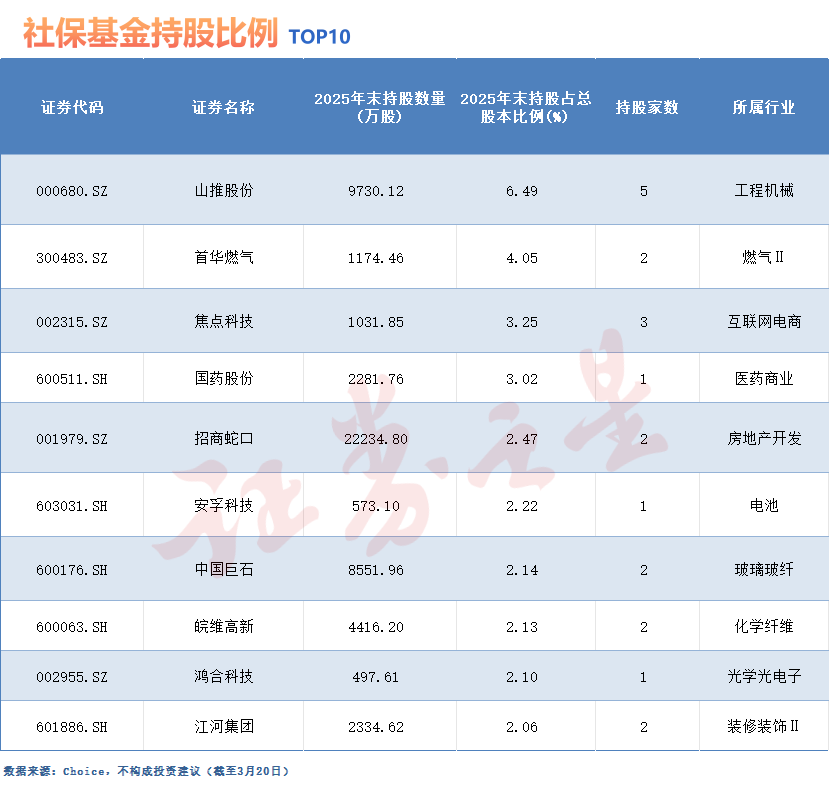從持股比例看,社保基金持有比例最多的是山推股份。截至2025年末,社保基金持股量佔總股本的比例爲6.49%,持股市值爲11.65億元,十大流通股東出現5只社保基金身影,合計9730.12萬股。