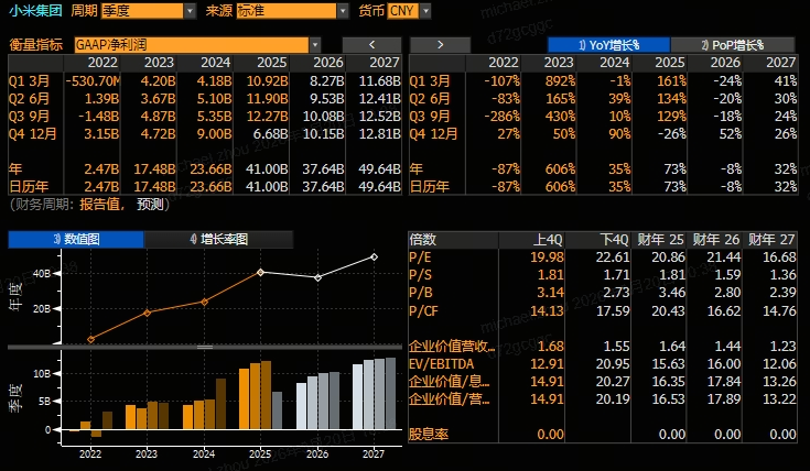 多頭以高盛爲代表,該行於20日發佈的研報中繼續維持公司的“買入”評級,並基於SOTP估值法給出41港元的目標價。在研報中,高盛認爲,憑藉公司領先的多模態AI能力及“人車家”生態系統中的豐富代理場景,確信小米能把握全球AI模型行業的巨大市場機遇。在財報前瞻及估值的角度上,高盛此前的研報則鮮明指出:利潤下滑是存儲週期 + 汽車 / AI 投入導致的短期陣痛,而非長期邏輯破局;當前估值已充分反映悲觀預期,因此建議投資者看多。