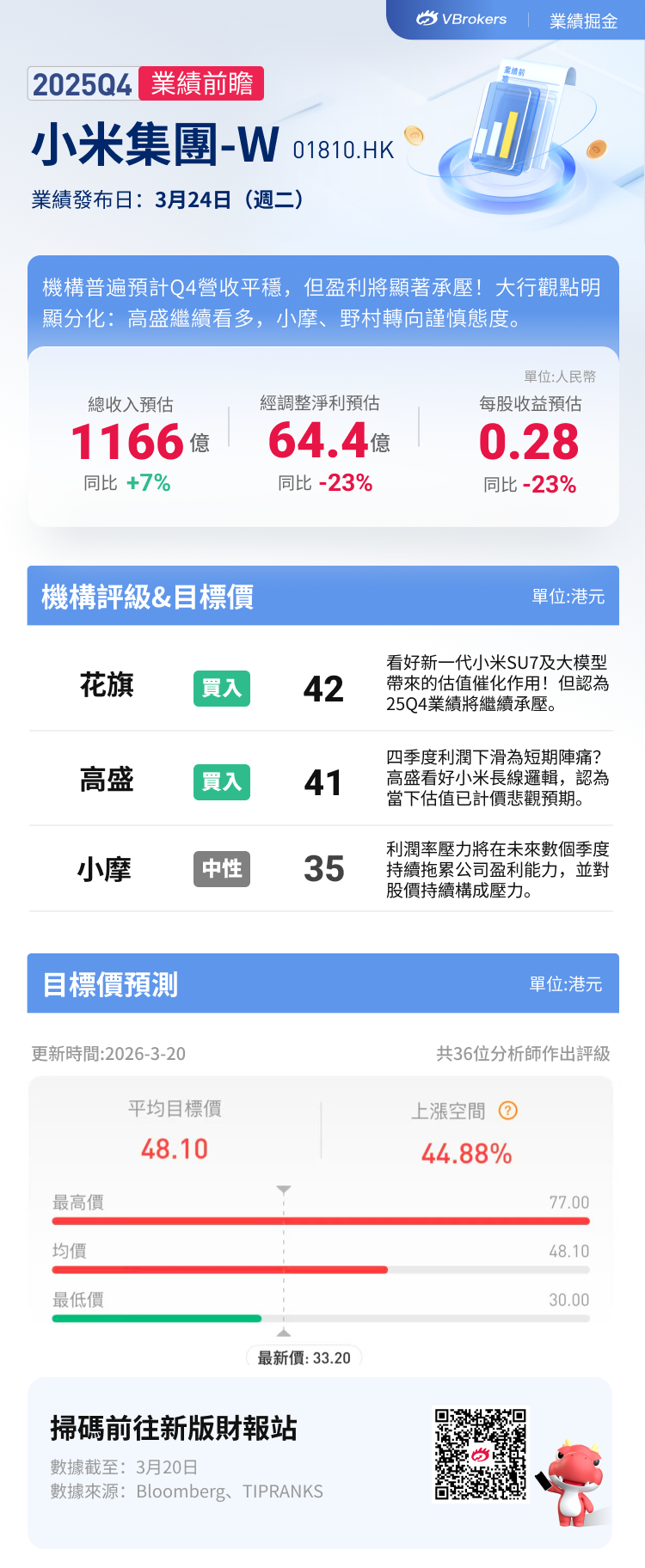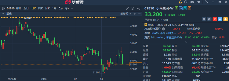 3月20日,春季發佈會次日,小米集團-W股價重挫逾8%,收盤報33.2港元。持續調整後的小米,當下投資價值幾何?華爾街各家大行卻給出不同看法。