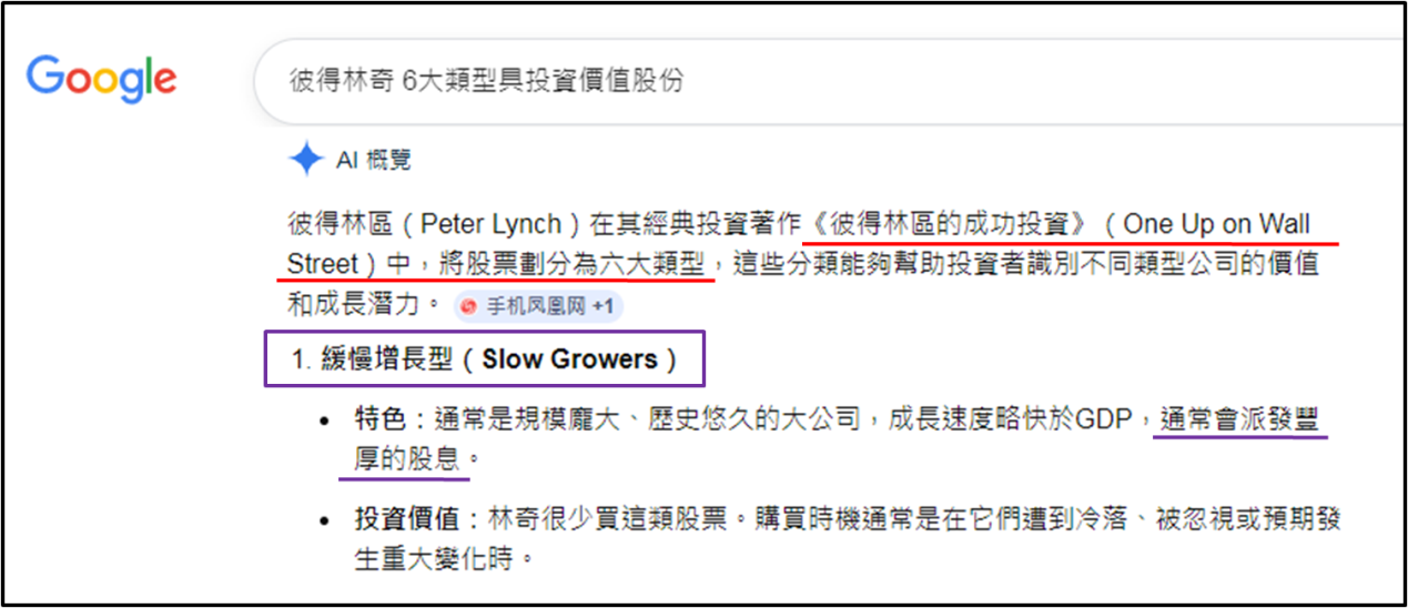 於6大類股票中,三類“增長型”已佔一半,證明林奇非常看重“成長股”的投資價值。而上述三類“增長型”,可視爲是明星股的不同成長階段,起初備受市場關注,業務正值高速增長期,亦即“快速增長型”。隨着時間推移,原先的增長引擎會在競爭、國策改變或科技進步等因素,漸見失卻高增長動力,變爲“穩定增長型”。之後業務發展由於上述因素,甚或其他不可抗力進一步增長放緩,最終演變爲“緩慢增長型”。雖然如此,林奇將“緩慢增長型”仍納入6大類股票,可見只要買得合時,投資價值依然存在。