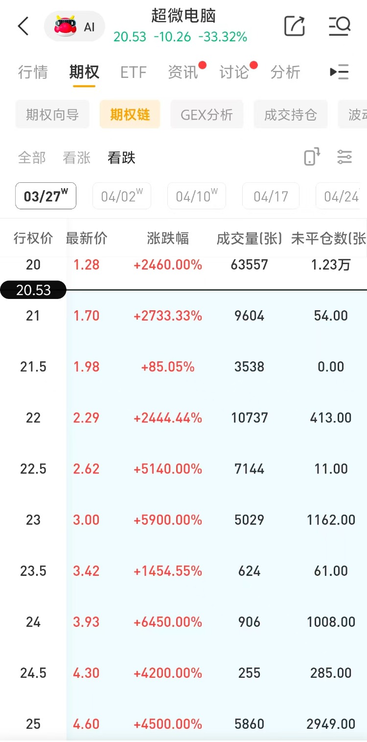 其中一看跌期權(SMCI_260327_P_20.0)交易量達6.36萬張,該合約行權價爲20.0美元,行權日在2026-03-27,該張期權漲2460.0%。
