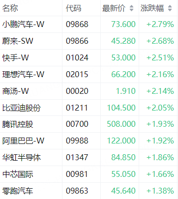 科指成分股中,小鵬汽車-W漲2.79%,蔚來-SW漲2.68%,快手-W漲2.51%,理想汽車-W漲2.16%,商湯-W漲2.14%。