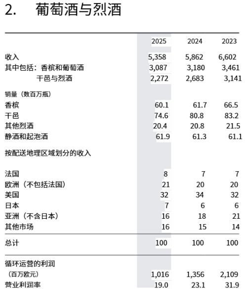 葡萄酒與烈酒部門則是集團收入承壓最爲突出的業務部門。該業務全年實現營收53.58億歐元,同比下降9%,有機增長率爲-5%。而在盈利能力方面,該業務的經常性業務利潤爲10.16 億歐元,較上年同期銳減25%,其營業利潤率已從2023年的31.9%下滑至2025年的19%。