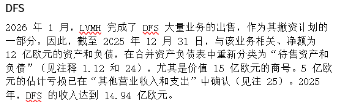在此趨勢下,LVMH卻同步進行着一項耐人尋味的資產處置。2026年1月,LVMH與中國中免簽署協議,將DFS位於香港、澳門等大中華區的業務及門店出售。財報顯示,LVMH將與該業務相關的淨資產賬面價值12億歐元的資產和負債歸類爲“待售”,並提前確認了5億歐元的出售虧損,這直接導致了2025年減值費用的大幅增加。雖然這是一次性資產處置,但也一定程度拉低了當年的賬面利潤。