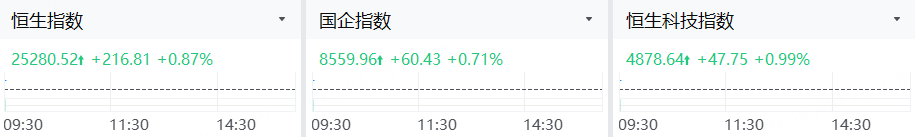 3月25日,港股三大指數高開,恒指漲0.87%,國指漲0.71%,恒生科技指數漲0.99%。
