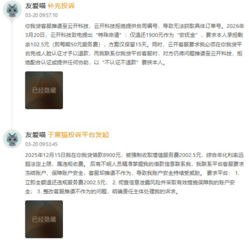 另有用戶先後提交兩起投訴及補充說明顯示,其於2025年12月15日借款8900元,被強制收取增值服務費2002.5元,綜合年化利率遠超法定上限;同時存在嚴重信息泄露問題,有不明人員精準掌握其借款信息聯繫本人,用戶聯繫平臺客服要求凍結賬戶、保障安全時,客服推諉不作爲,導致賬戶安全持續受威脅。