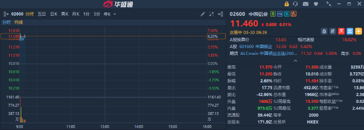 華盛資訊3月30日訊,港股鋁業股開盤強勁大漲,南山鋁業國際漲逾8%,中國鋁業漲超6%,中國宏橋漲近5%,俄鋁漲近3%。