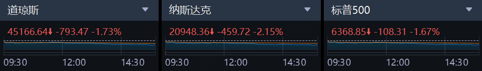 上週五,美股三大指數集體收跌,截至收盤,道瓊斯工業平均指數跌1.73%,報45166.64點;納斯達克綜合指數跌2.15%,報20948.36點;標準普爾500指數跌1.67%,報6368.85點。