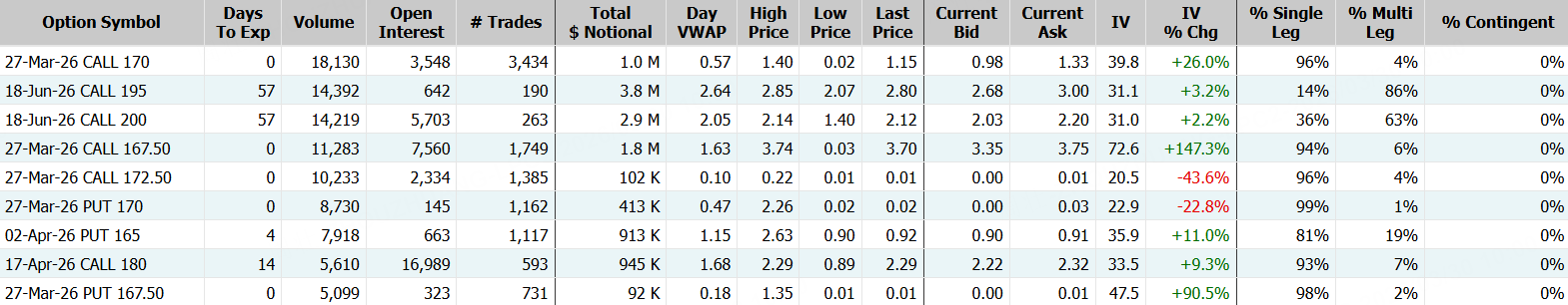 期權方面,埃克森美孚當日成交22.6萬張,較90日均量放大近2倍,看漲期權佔比攀升至72.5%,其中於3月27日到期的170美元行使價的看漲期權成交居前,成交逾1.8萬張。