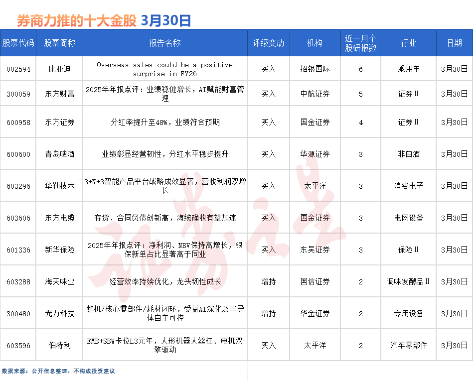 比亞迪最受券商關注,近一個月獲東吳證券、愛建證券、華金證券、開源證券等6份券商研報關注,位居3月30日券商力推股榜首。