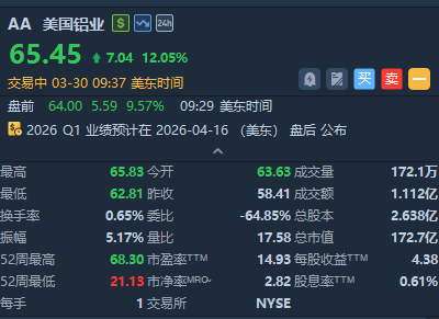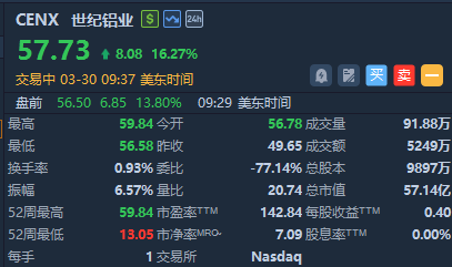 華盛資訊3月30日訊,鋁業股漲幅居前,世紀鋁業大漲超16%、美國鋁業漲超12%。