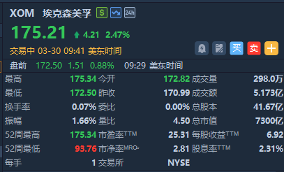 油氣股集體走強, 埃克森美孚漲超2%、西方石油、雪佛龍漲超1%;