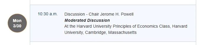 美聯儲主席鮑威爾將在今天晚些時候(北京時間22:30)亮相,參加哈佛大學經濟學原理課程的一場主持討論會。
