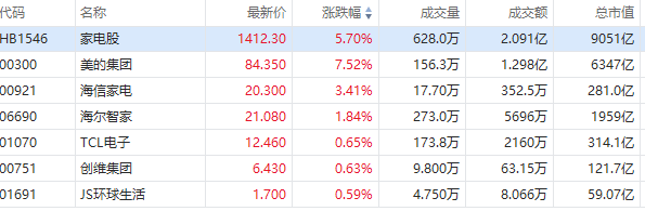 港股家電股集體走高,美的集團績後大漲超7%,現報83.35港元,消息面上,公司2025年股東應占溢利439.45億元,同比增長14%,海外OBM佔比超45%驅動業績增長;海信家電漲超3%、海爾智家漲近2%,TCL電子、創維集團跟漲。