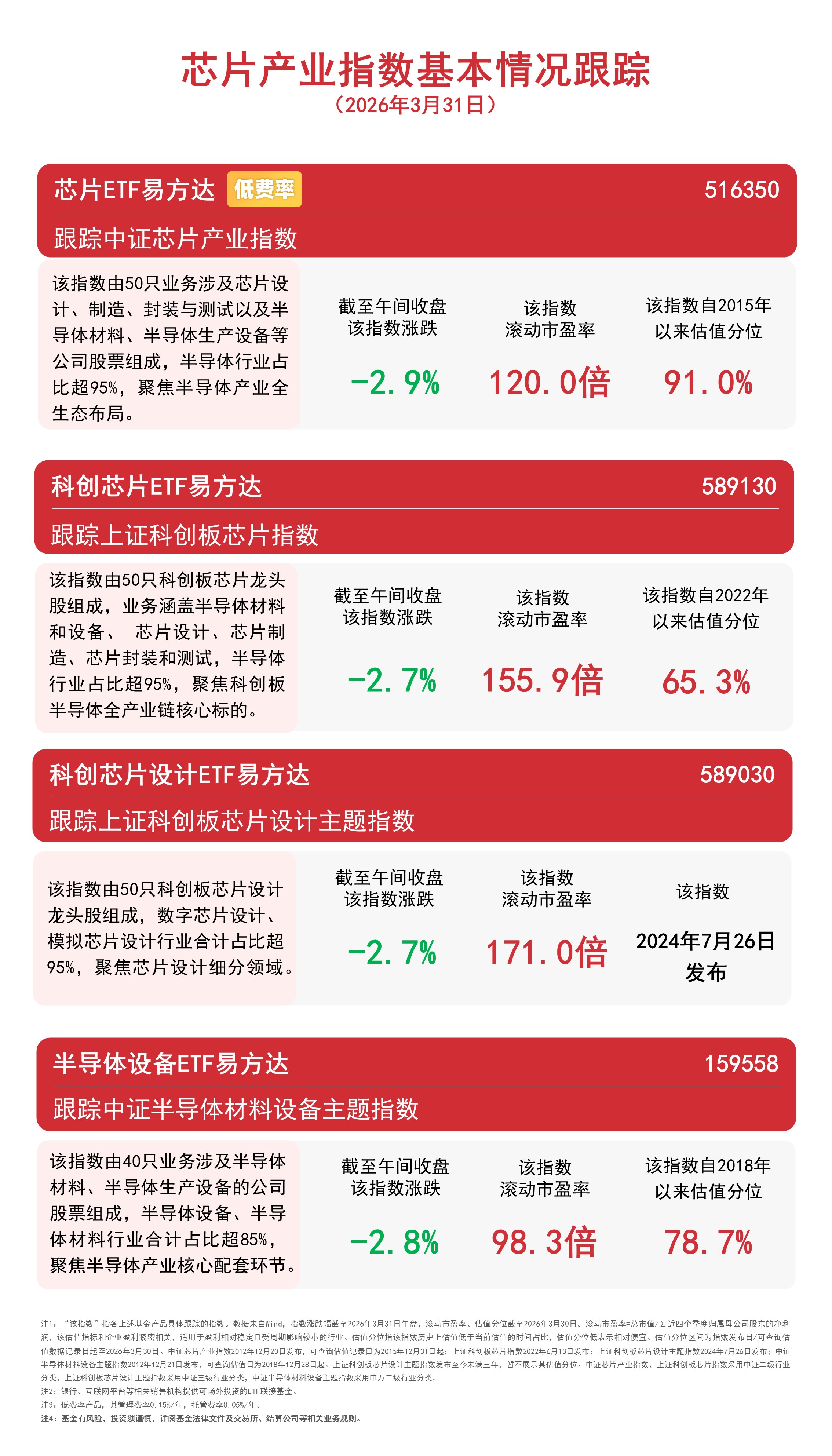 截至午間收盤,上證科創板芯片指數、上證科創板芯片設計主題指數均下跌2.7%,中證半導體材料設備主題指數下跌2.8%,中證芯片產業指數下跌2.9%,半導體設備ETF易方達(159558,聯接基金A/C:021893/021894)半日淨申購達1300萬份。