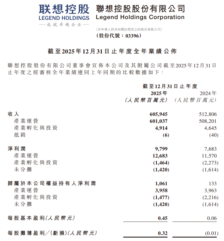 3月31日,聯想控股港交所公告,截至2025年12月31日止年度,公司總收入爲人民幣6,059.45億元,同比增長18%;年內歸屬於本公司權益持有人淨利潤爲人民幣97.99億元,同比增長28%;每股基本盈利爲0.45元。