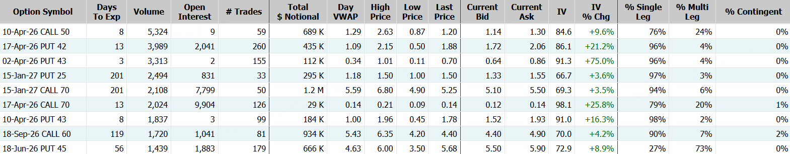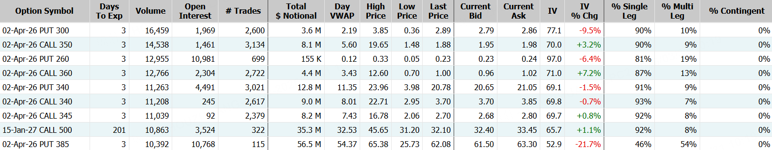 期權方面,美光科技當日成交73.4萬張,較90日均量放大近2倍,看漲期權佔比52.4%,其中於4月2日到期的300美元行使價的看跌期權成交居前,成交超1.6萬張。