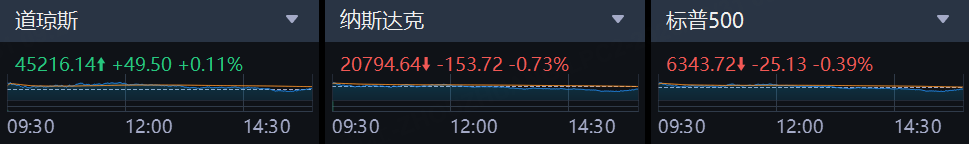 美東時間週一,美股三大指數漲跌不一,截至收盤,道指漲49.50點,漲幅爲0.11%,報45216.14點;納指跌153.72點,跌幅爲0.73%,報20794.64點;標普500指數跌25.12點,跌幅爲0.39%,報6343.73點。