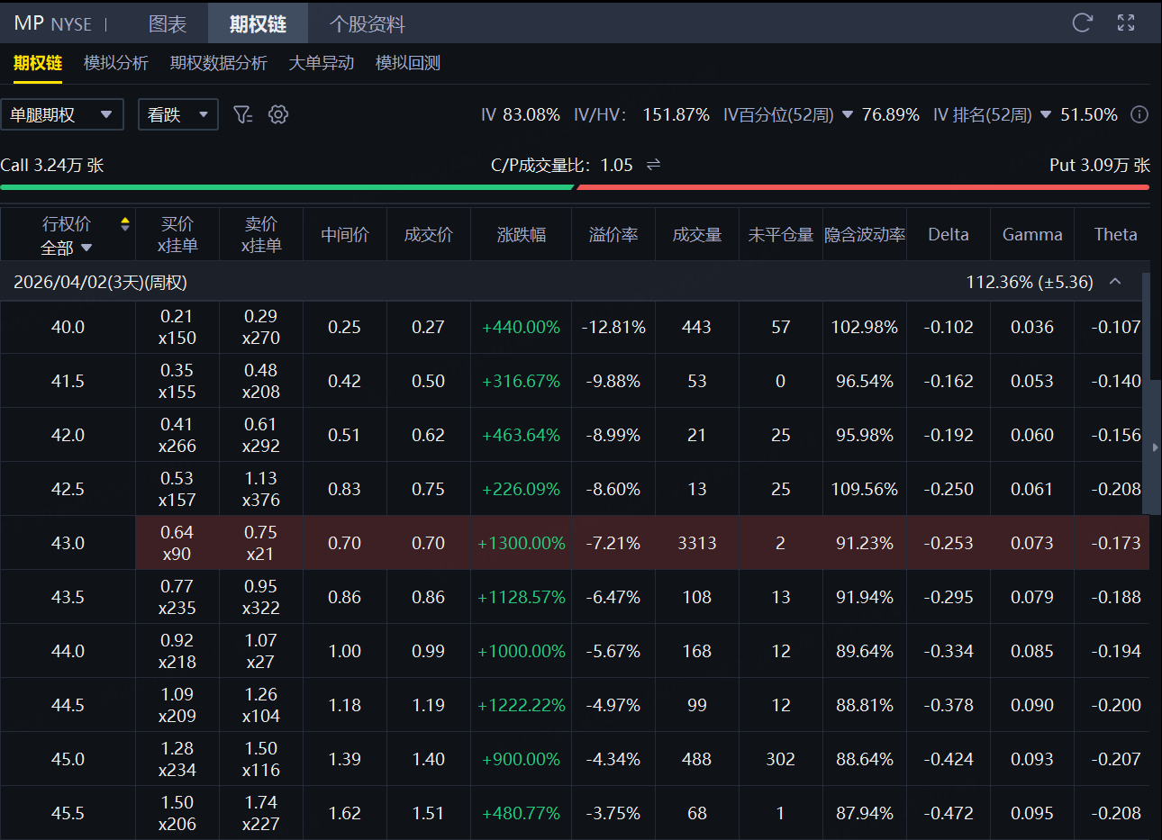 稀土概念股集體大跌,MP Materials跌近12%;期權方面,MP Materials當日成交6.33萬張,較90日均量放大近2倍,看跌期權佔比升至48.8%,從期權鏈上看,MP Materials多張Put單翻倍大漲,最高飆漲1300%。