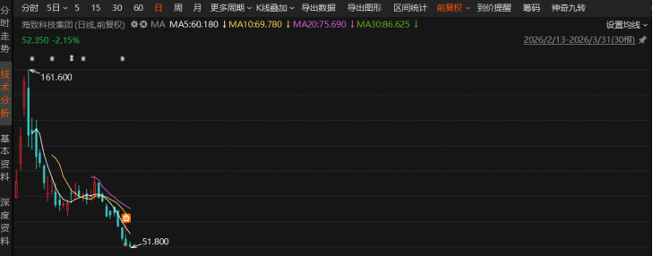 儘管海致科技集團在業務層面展現出增長潛力,但市場的樂觀情緒似乎並未持續太久。二級市場上,公司上市首日迎來極爲火爆的行情,最終收盤報92.6港元/股,收漲242%,盤中最高漲幅一度觸及268%。上市前三日(2月13日至15日),公司股價累計漲幅約470%。然而短暫暴漲過後,股價走勢急轉直下,3月30日盤中下探至新低。截至3月31日收盤,股價報52.75港元/股,跌幅1.4%,較最高點回撤約67%,目前總市值211億港元。(本文首發證券之星,作者|陸雯燕)