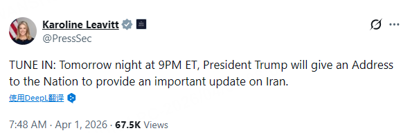 白宮新聞祕書在社交媒體上稱,特朗普將於當地時間明日晚上9點就伊朗問題向全國發表講話。