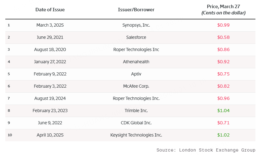 2020年以來,軟件行業曾掀起一波併購熱潮,如今相關債券價格已大幅縮水。在2020年至2022年軟件併購高峰期間發行的前十大債券中,半數交易價格已跌至面值的90%以下,其中三隻低於80美分。以Salesforce爲例,該公司2021年爲收購Slack發行的債券,截至上週五交易價格僅爲面值的58美分,遠低於發行時的近99.5美分(約1美元)。