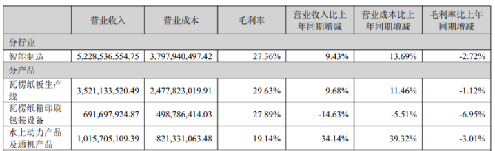毛利率方面,2025年,瓦楞紙板生產線毛利率爲29.63%,同比減少1.12個百分點;其他國家地區的毛利率爲29.69%,同比減少1.72個百分點。