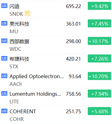 美股異動 | 光通信、存儲概念股大漲!AAOI漲超11%,西部數據漲超10%