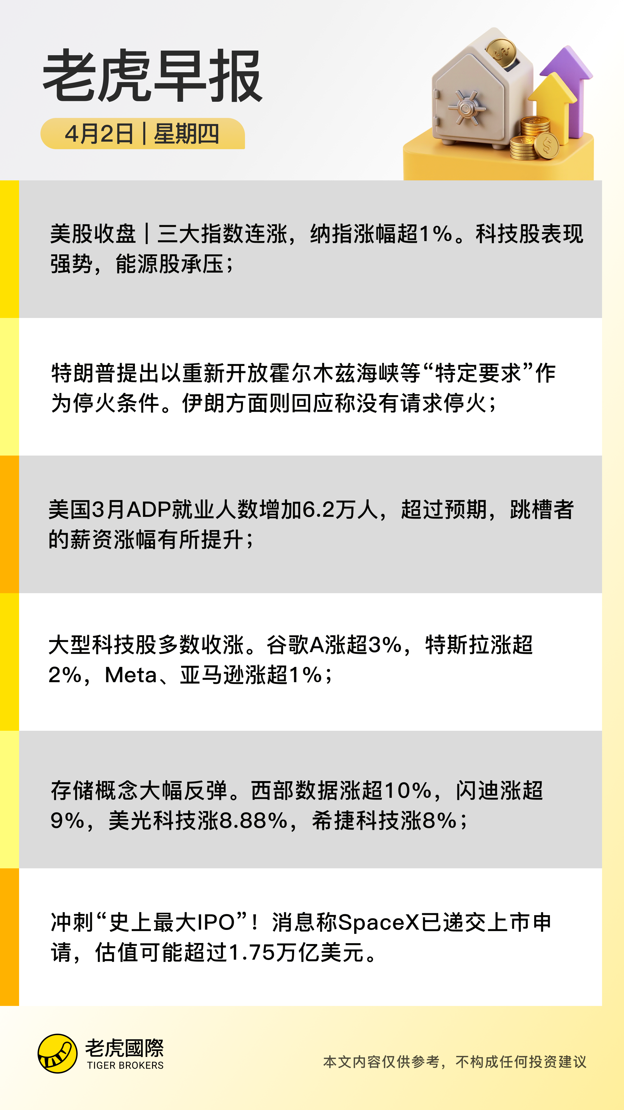 週三(4月1日),市場對美伊戰爭結束保持樂觀預期,美股三大指數連續第二日收漲。截至收盤,道指漲224.35點,漲幅爲0.48%,報46565.86點;納指漲250.32點,漲幅爲1.16%,報21840.95點;標普500指數漲46.84點,漲幅爲0.72%,報6575.36點。