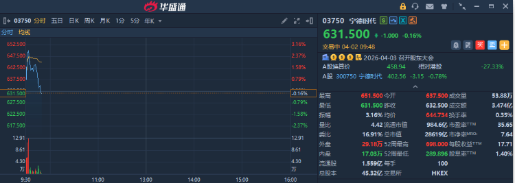 寧德時代盤初一度漲約3%,隨後快速回落,現由漲轉跌。