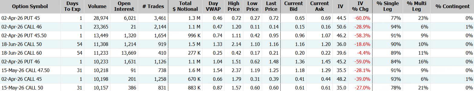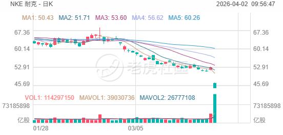 期權方面,耐克當日成交66.4萬張,較90日均量放大逾5倍,看跌期權佔比升至47.3%,其中於4月2日到期的45美元行使價的看跌期權成交居前,成交近2.9萬張。