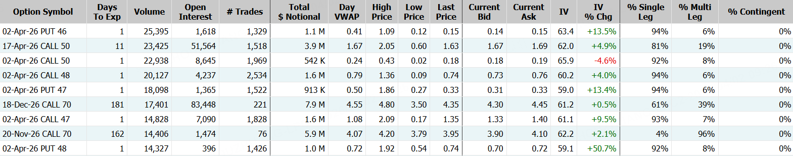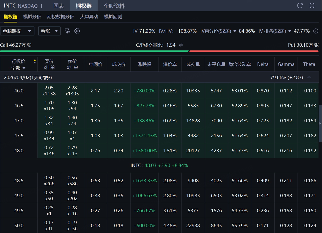 期權方面,英特爾當日成交76.37萬張,看漲期權佔比逾60%,其中於4月17日到期的50美元行使價的看漲期權成交居前,成交超2.3萬張。此外,從期權鏈上看,英特爾多張Call單大漲,最高漲超1600%。