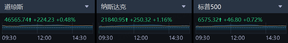 美東時間週三,美股三大指數集體收漲,此前美國總統特朗普暗示中東衝突可能接近尾聲,提振了市場風險偏好。截至收盤,道指漲224.23點,漲幅爲0.48%,報46565.74點;納指漲250.32點,漲幅爲1.16%,報21840.95點;標普500指數漲46.80點,漲幅爲0.72%,報6575.32點。