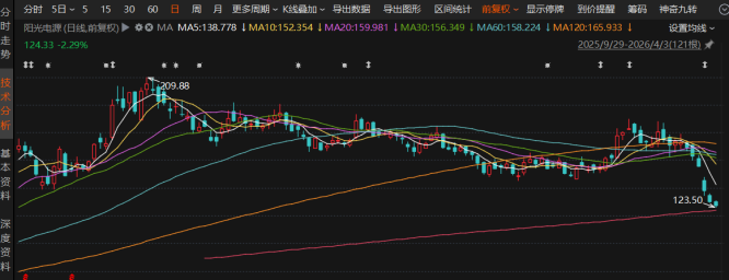 單季業績暴雷迅速傳導至二級市場,陽光電源股價遭遇連續性重挫。4月1日及2日,公司股價接連大跌,跌幅分別爲10.82%、5.36%。4月3日保持跌勢,截至午間收盤報124.33元/股,跌幅2.29%,總市值2578億元。今日盤中創下2025年10月以來新低,市值兩日半蒸發約548億元。值得注意的是,此次股價深度調整並非孤立行情,而是自3月27日起下跌態勢的延續。截至4月3日午間收盤,公司期間股價累計回撤約42%。