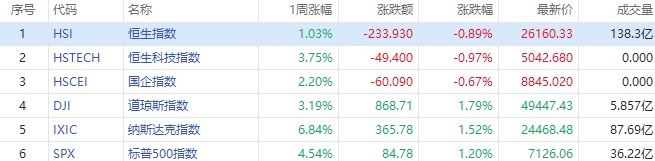 港股方面,本週恒生指數漲幅1.03%,報26160.33點;恒生科技指數漲幅3.75%,重回5000點上方,報5042.68點;國企指數漲幅2.2%,報8845.02點。