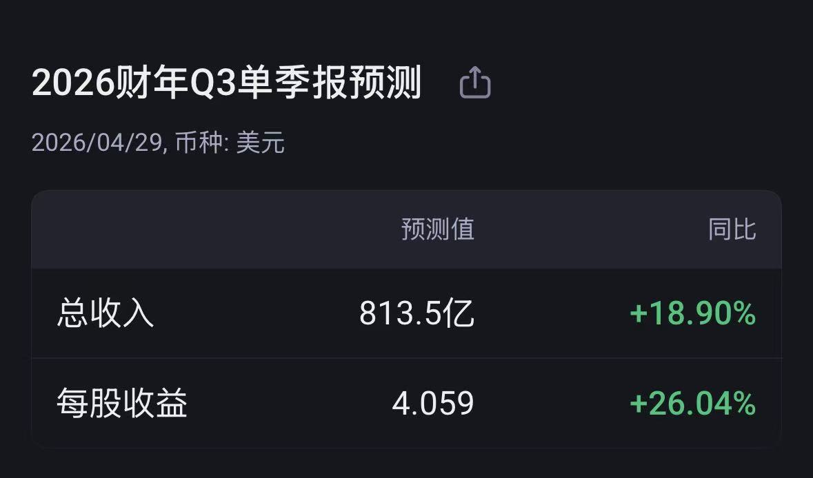 微軟將於美東時間4月29日盤後發佈2026財年第三季度財報。根據老虎國際APP數據來源預測,微軟2026財年第三季度營收有望達到813.5億美元,同比增長18.9%;每股收益(EPS)預計爲4.06美元,同比增幅達26.04%。
