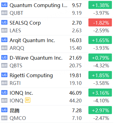量子計算概念股下跌,D-Wave Quantum、IONQ跌超4%,Arqit Quantum、Quantum Computing、Rigetti Computing跌超3%,SEALSQ、昆騰跌超2%。