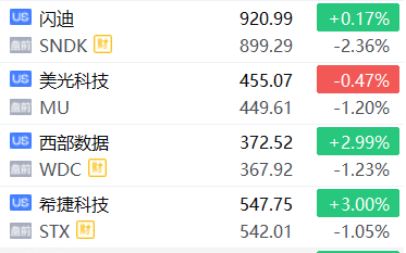 存儲概念股回調,閃迪跌超2%,希捷科技、美光科技、西部數據跌超1%;
