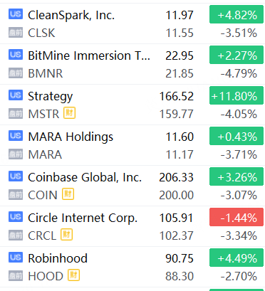加密貨幣股盤前普跌,Strategy、 BitMine Immersion Technologies Inc.跌4%,Coinbase Global, Inc.、Circle、Cleanspark跌超3%, Robinhood跌超2%;