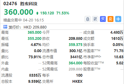華盛資訊4月20日訊,“全球AI算力PCB龍頭”勝宏科技正在港股暗盤交易中。截至發稿,大漲超71%,中籤一手賬面浮盈15012港元,最新總市值超3441億港元。