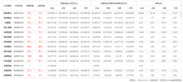 行業重點公司最新盈利預測綜合值