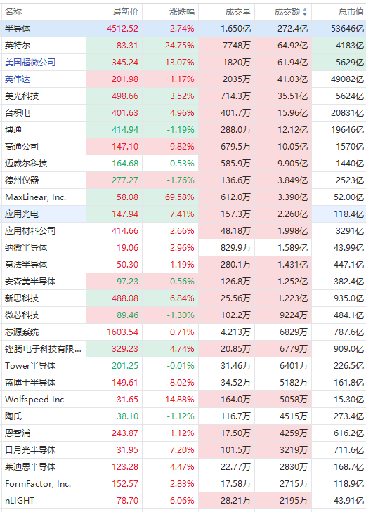 成分股中,英特爾績後暴漲超24%,AMD大漲逾10%,ARM、高通漲超8%,臺積電漲超4%,泛林集團漲超3%,美光科技、阿斯麥漲近3%。